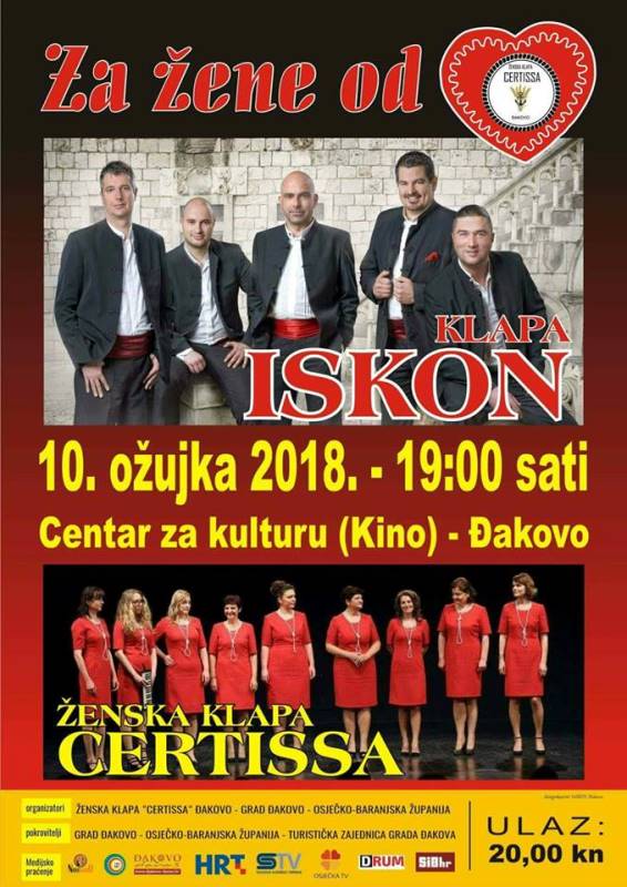 U organizaciji ženske klape "Certissa" u subotu, 10. ožujka, održat će se koncert "Za žene od srca", doznali smo od voditeljice klape Manuele Jerković Prošlogodišnji koncert u prepunom Centru za kulturu garancija je da će i ove godine splitska klapa Iskon napraviti dobru atmosferu "Za žene od srca" koncert je koji ne smijete propustiti jer i ove godine povezujemo zelenu i plavu Hrvatsku, a ujedno se pripremamo i za 3. Smotru klapa koja će se održati u našemu gradu, poručuje Jerković.